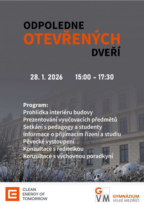 Srdečně zveme zájemce o studium, rodiče, absolventy a širokou veřejnost na Odpoledne otevřených dveří. Těšíme se na setkání s vámi.